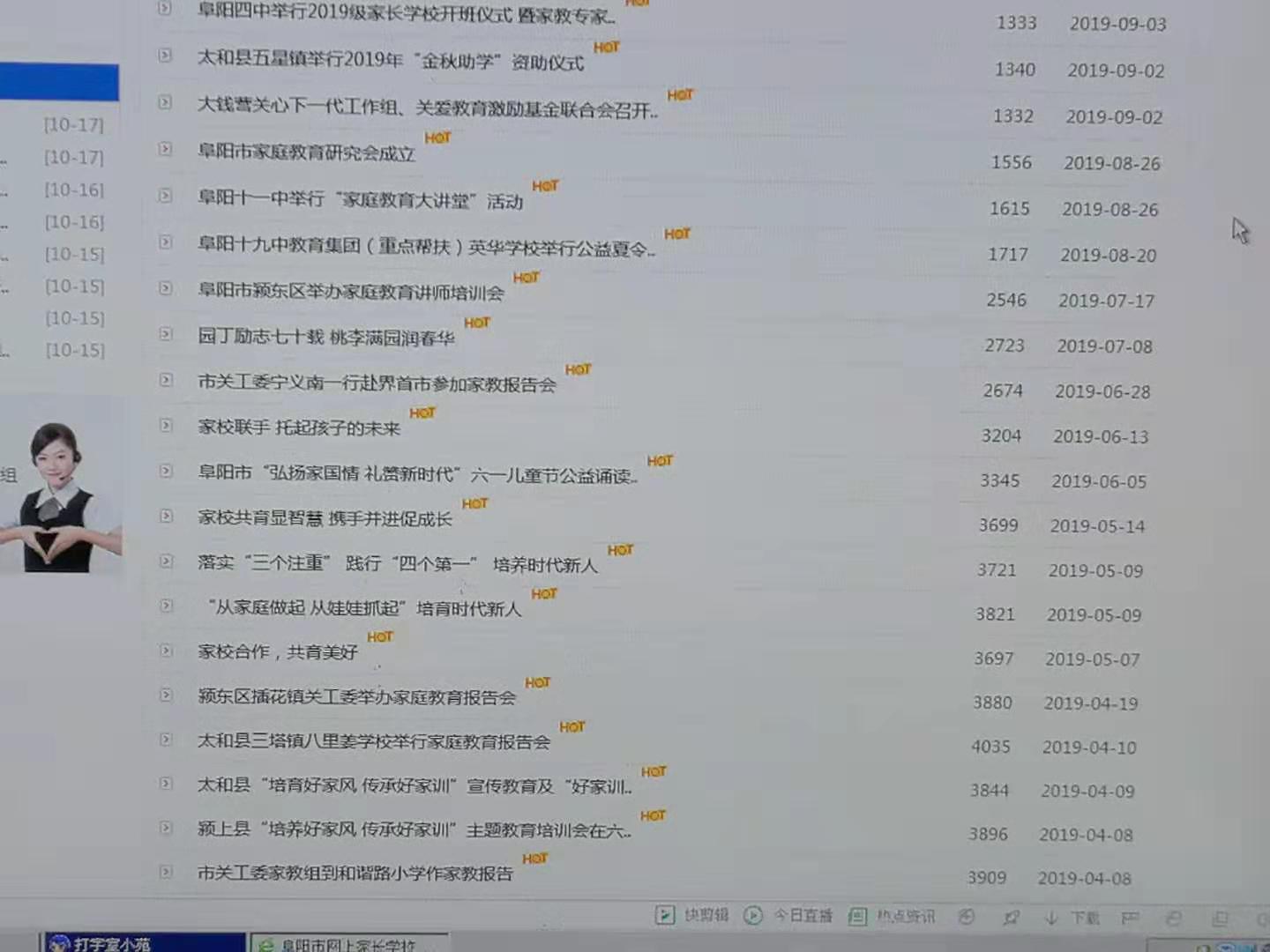 我们把“阜阳市网上家长学校”视为网络时代的电子杂志。根据家庭教育的实际需要,精心设计了内容丰富、吸引眼球的栏目,(详见上图的“栏目设置”)通过有关会议、家教报告、手机微信等渠道,把彩页发至各县市区关工委、教育局、妇联及各中小学、幼儿园的家长学校和广大家长。家教组同志深入基层家长学校调研或作家教报告,必散发“阜阳市网上家长学校简介”,针对家长提出的家教问题,积极向家长推介网校里有助于解决实际问题的好文章。我们通过手机微信,把网校彩页图片和二维码发给亲友的微信群和朋友圈,广大家长运用手机扫描二维码即可登录“阜阳市网上家长学校”的各个栏目,阅读需要的文章。登录“方针政策”栏,可学习习总书记关于“注重家庭、注重家教、注重家风”的一系列讲话和有关家教的文件、通知,了解关于家教的方针政策;登录“家教新闻”栏,可及时了解我市各县市区关工委、各级各类家长学校开展家教活动的新闻;登录“家长课堂”栏,可学习家教的科学理论、家教的基础知识、解决实际问题的方法、经验;登录“德育天地”和“心灵导航”,可学习如何对孩子进行思想品德和心理健康教育;“亲子学苑”栏目上传了很多可供两代人互相学习、共同成长的好文章;“家风家教”栏目上传了许多中华传统的优秀家风家训、老一代革命者的家风家训以及历代名人的家风家训,学习我市优秀家长培育好家风、传承好家训的经验和体会,既有利于提高家教水平,也有利于家长和儿童学习中华优秀传统文化和革命文化,提升文化素养,增强文化自信。 第二、广泛征集、及时编发“家教新闻”,加大宣传力度,推动我市家教工作。 为调动我市各县市区关工委、各级家长学校的积极性,扩大网校的影响,推动家教工作,我们经常向各县市区关工委、各级各类家长学校征集家教活动新闻稿,网校负责人也经常采访、及时编写市关工委家教组领导深入基层宣讲家教的新闻稿件。各县市区关工委、各级各类学校积极支持,主动配合,及时把他们开展的家教活动、德育活动的新闻发送到网校,由网校管理者审读、编辑后上传到网校的“家教新闻”栏目。 从2017年11月到2019年9月,我们上传了82条家教新闻,点击量在2000人次以上的58条,其中点击量3000以上人次的有17条,4000以上的有5条,最多的有4610人次,总点击量约有16万人次,平均点击量远远超出其他栏目的文章。 2019年10月22日统计,“家教新闻”栏目首页的20条家教新闻是2019年4月-9月期间上传的,点击量最少的1条也有1333人次,最多的有4035人次。其中点击量在1000-2000人次之间的有6条,点击量约8000多人次;点击量在2000-3000人次之间的有3条,点击量约7000多人次;点击量3000-4000人次以上的有10条,点击量约35000人次,4000人次以上的有一条,点击量4035人次,合计约5万人次。其中,发来家教新闻较多的县市区是颍泉(7条)、太和(4条)、颍东(4条)。(详见下图)